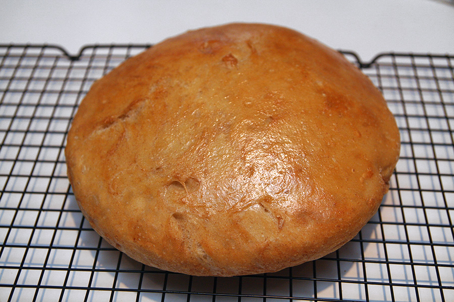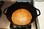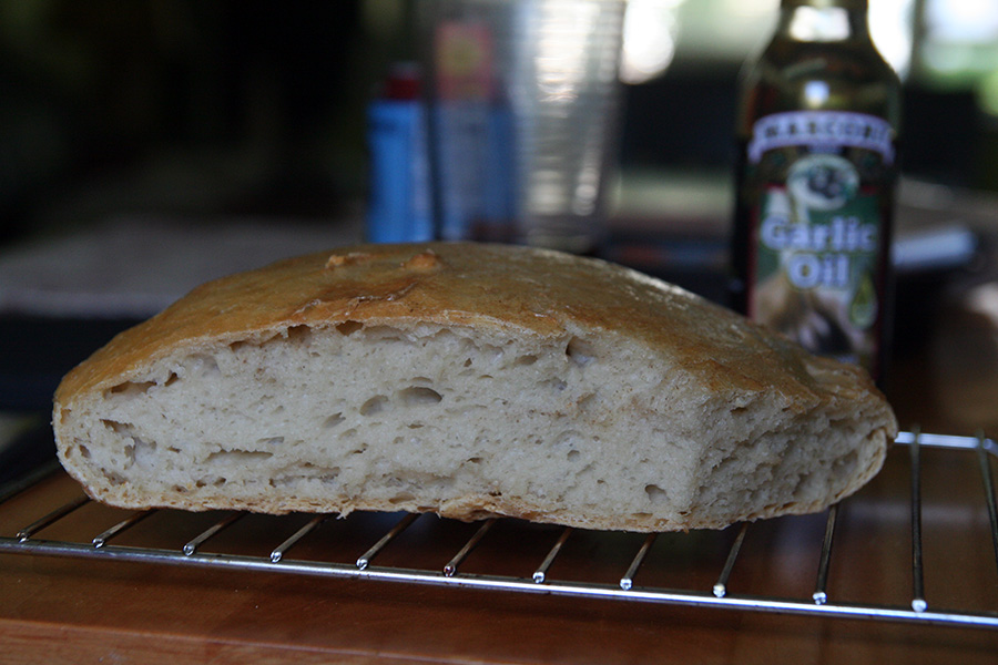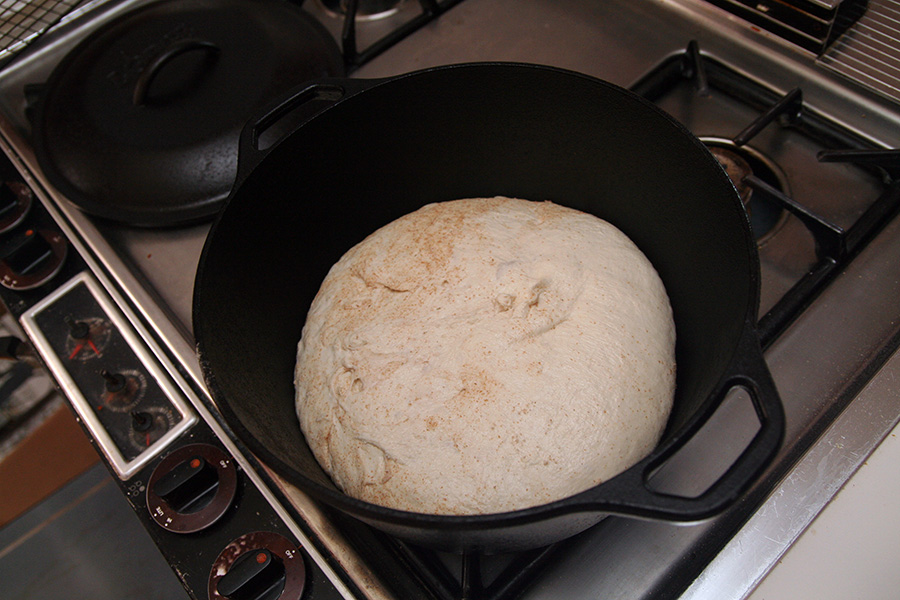 properly and had unforeseen empty pockets which meant i ended up using less flour and more water. after 2 hours of the second rise, the dough did get a little bit bigger, but it was still too gooey. i poured it into the cast iron and baked it in the oven. i brushed some egg white on the surface during the last 15 minutes of uncovered baking to get a glaze. the final bread lacked any good fissuring and was flat and stiff. it was still edible, but having tasted good bread, all i wanted to do was start over. next time, if the dough looks too wet, i should go ahead and add more flour, irregardless of portions.