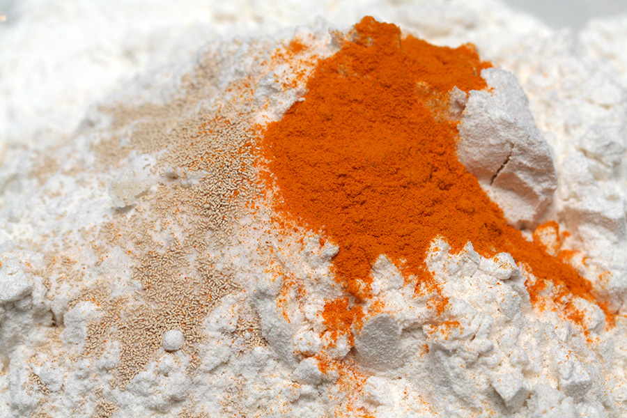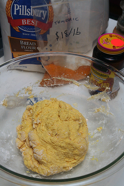 this time paying careful attention to the flour sifting, making certain i scooped out 3 cups. i also added a teaspoon of tumeric (some call it the poor man's saffron), no reason other than i had a lot of it and wanted something different (yellow bread). mixing all the ingredients together, there was definitely a noticeable difference from last night. the dough was dry enough that i considered maybe adding some more water, but a dryish dough is exactly what i want for a good bread.