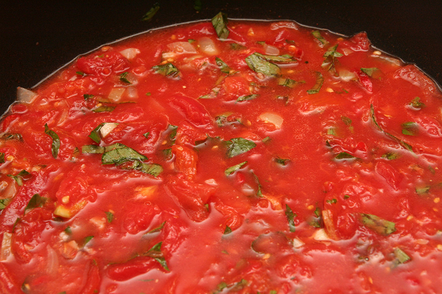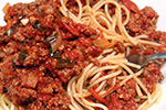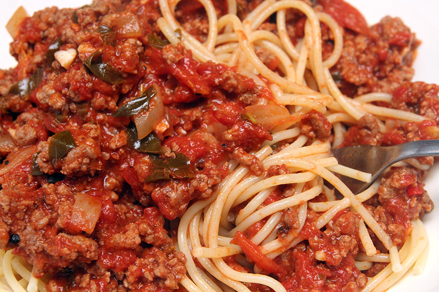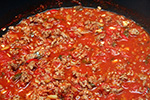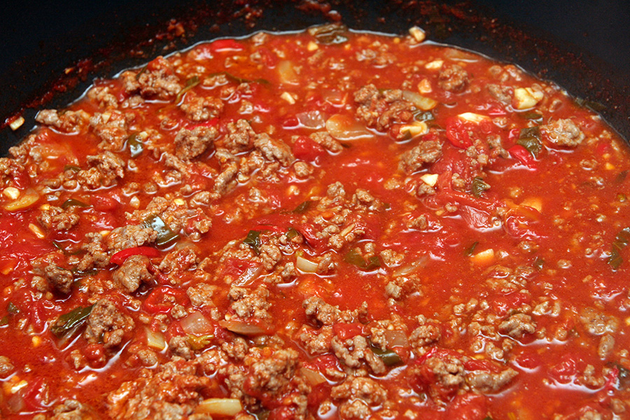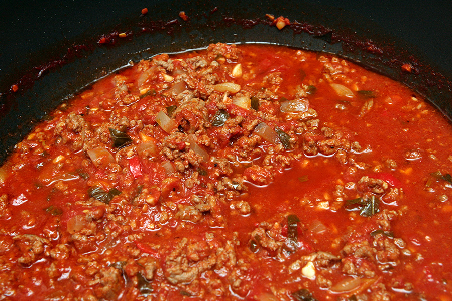 one thing i didn't do this time was add any tomato paste, because i thought i interfered with a pure tomato sauce. however, without tomato paste, the sauce remained too watery, not sauce-like at all. i ended up squeezing a few tablespoons of concentrated tomato paste from an old tomato paste tube. that thickened things up right away. for future reference, tomato paste is definitely essential. after the tomato sauce was mostly ready, i cooked up the ground beef in a separate pot and combined the two, simmering it for a little while longer while i boiled some spaghetti noodles. the final result wasn't bad, definitely tasted healthier since i made my own sauce.
