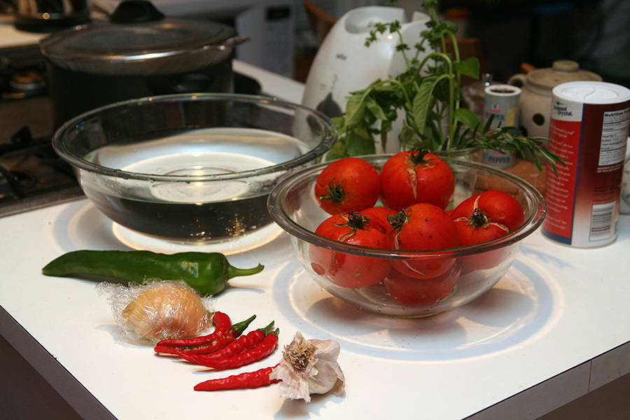 with the 3 tomatoes i picked up and the handful from last time still in the fridge, i went ahead and made some more tomato sauce. the tomatoes aren't in very good shape, with a lot of cracks and some mold, but mashed into a sauce it wouldn't matter. i followed the same steps as the first and last time i made tomato sauce. this time i added some salt, brown sugar, and some baking powder. the sauce seemed flat, and i tried adding some worcestershire sauce and ground pepper to give it some more flavor.