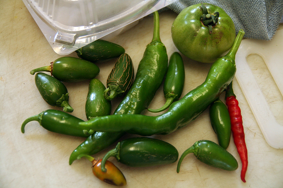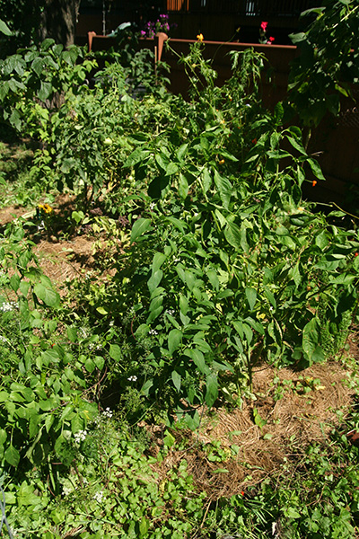 i hadn't been to the garden since the tropical storm this weekend, but i wasn't surprised to see all my sunflowers had toppled. i pulled them out of the ground and tossed them. i also pulled up a bunch of asiatic dayflowers that seemed to have run rampant. those, plus some wild morning glories and wild cucumber vines. i was there for just an hour, but it left my a sweaty dirty mess and i got a few mosquito bites as well (they bit through my t-shirt). i didn't manage to collect about a dozen assortment of hot peppers and one green tomato that had fallen on the ground.