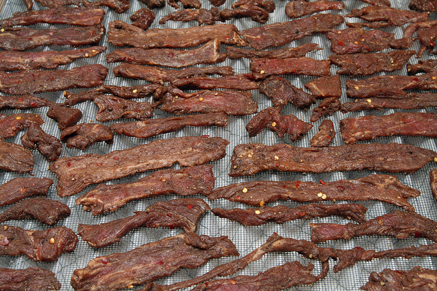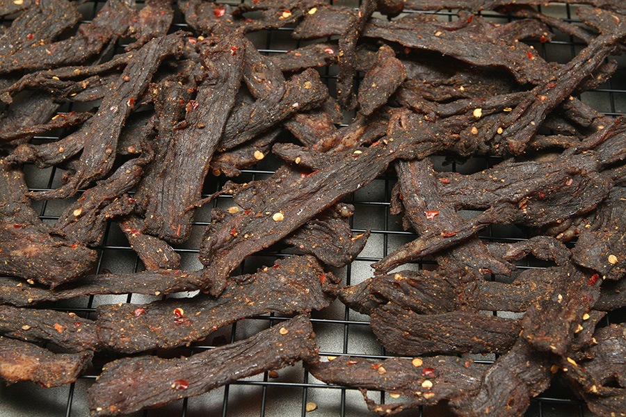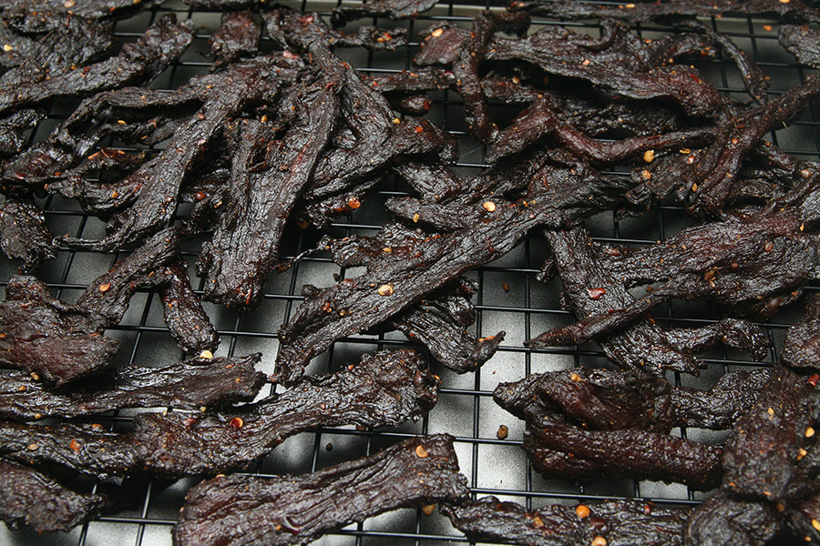 turns out 2 hours was probably too much, because the jerky seemed too dark and dry. i couldn't taste any cumin, and there was no spiciness to the jerky. i think leaving out the sichuan peppercorns really affected the usual potency. this latest batch tasted like dried soy sauce jerkies, not really that great. thankfully i have a 2nd batch marinating in the fridge. i think that one will be better, and i won't bake as long.
