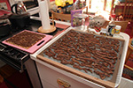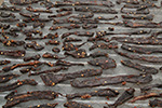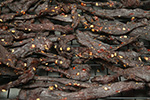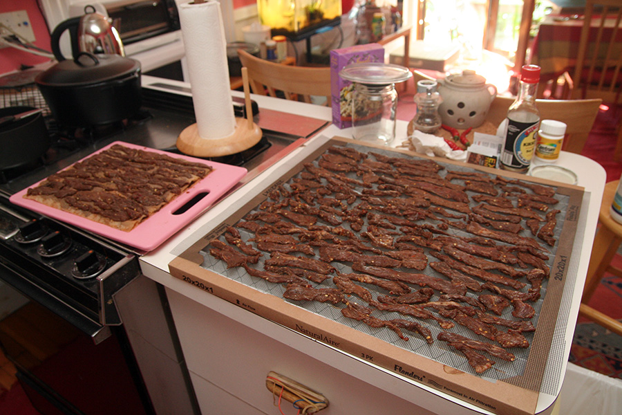 i stopped the fan dehydrator around 6:00. even though it'd been blowing for less than 8 hours, an inspection of the jerky revealed that they were already pretty dry. maybe because there was less meat this time, it dehydrated everything faster. i did notice the topmost filter was bowing upwards during the drying process, like there was too much wind blowing. the lesson i learned yesterday is not to overdry the jerky. i gathered up all the pieces then put them into the oven, baking for about an hour. once again, the key was not too dry.