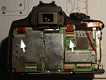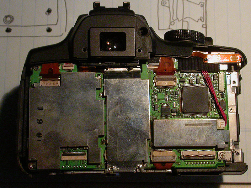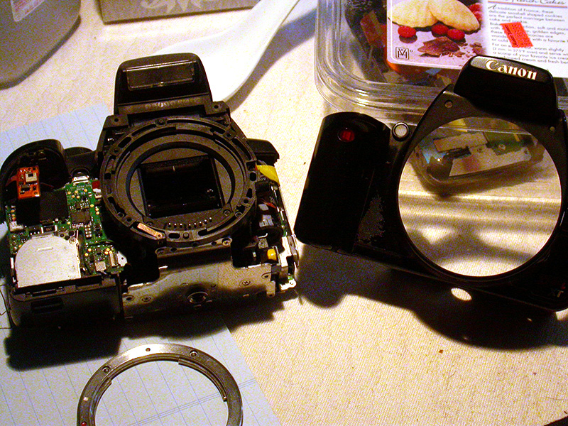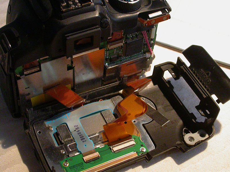 i removed the back cover first. it was attached to the main camera body by two ribbons that i disconnected. i put the back cover (which included all the guts for the rear LCD display) in a clear plastic box to keep off the dust.