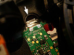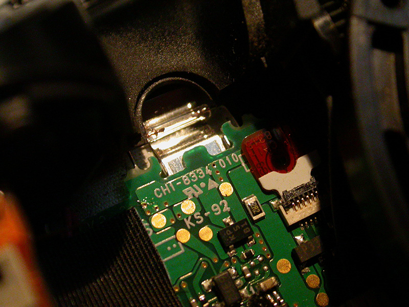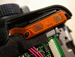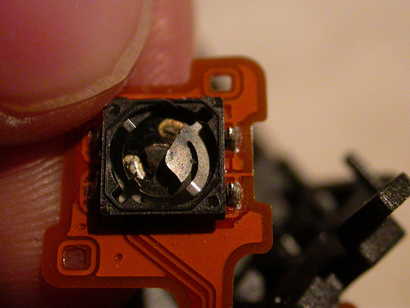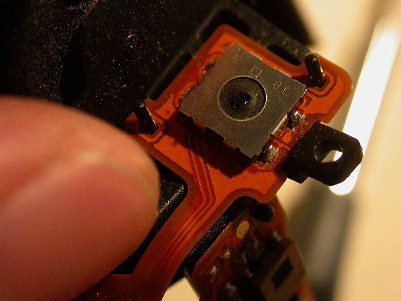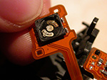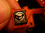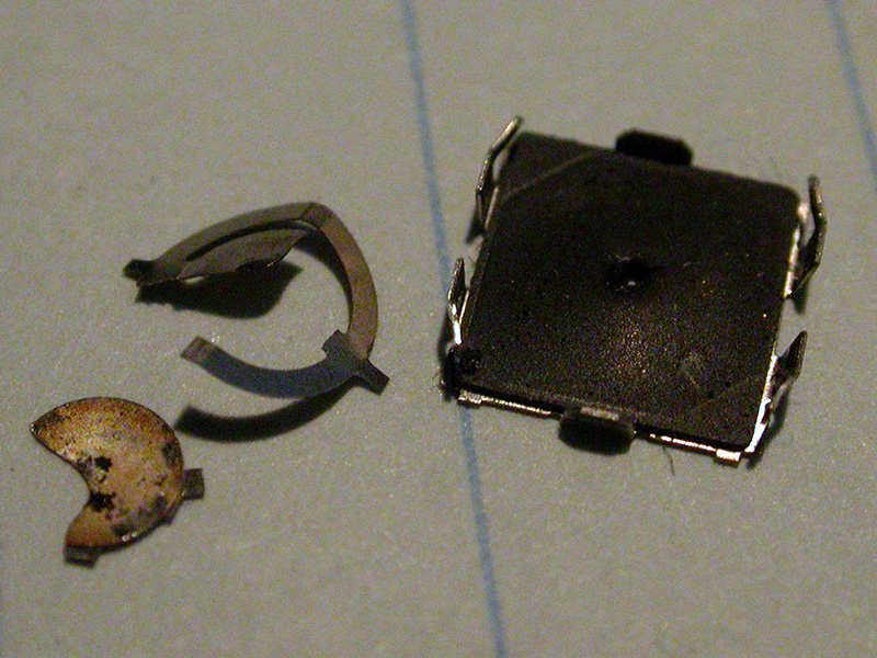 2 more screws were removed (so actually 24 screws total) before i managed to free the shutter button and main dial assembly. and there it was: the shutter button switch. right away i could see something was wrong. the rubber diaphragm had a hole in it from me having pressed the button on it a million times. using the tip of a safety pin, i pried off the metal bracket of the switch. inside was a mangled piece of trigger wafer. normally it has a crosshair pattern but this one had broken into several pieces. it even looked like there was some kind of short circuit as some point because there looked to be some scorch marks (maybe from water getting inside).