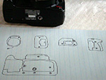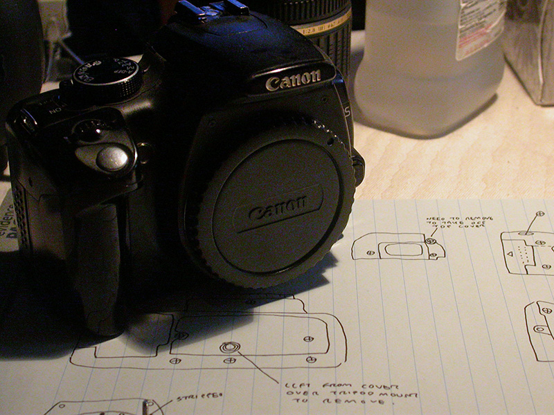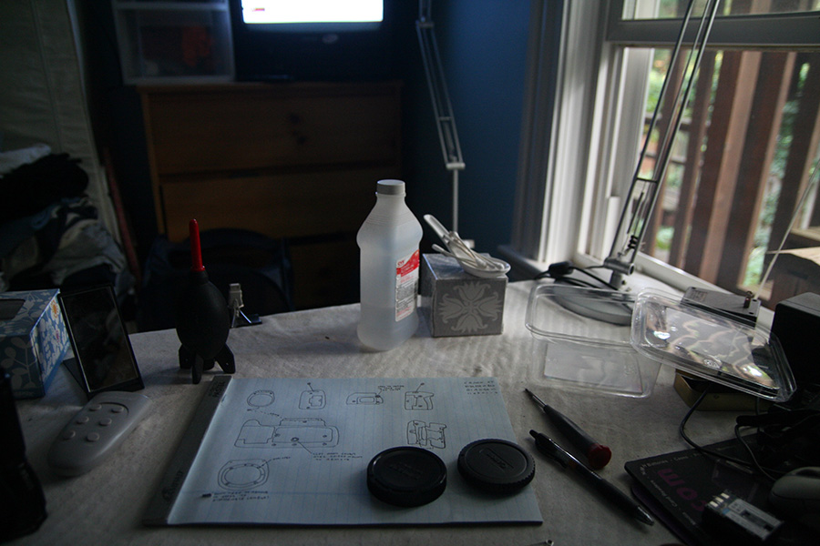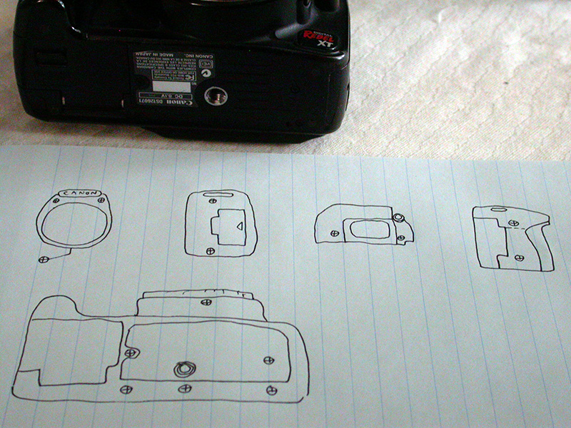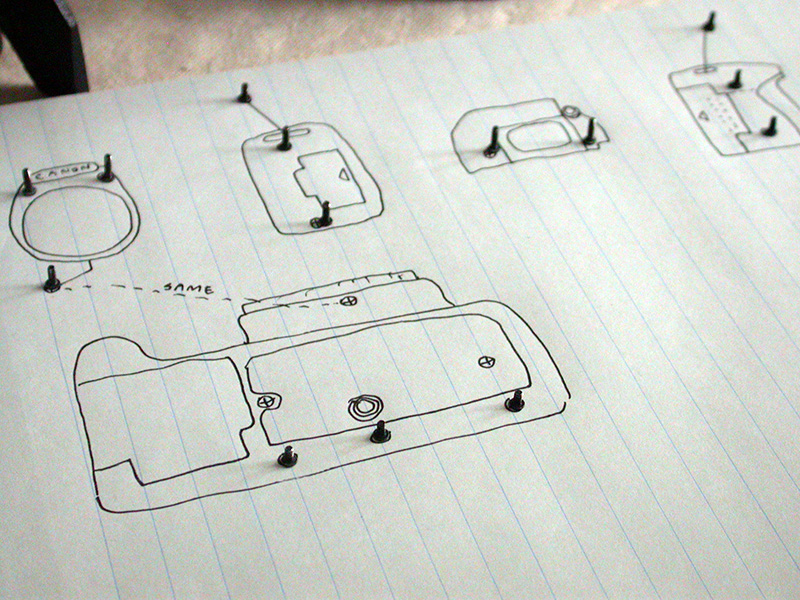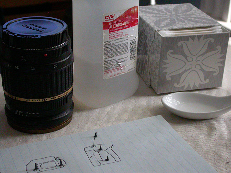 i started by diagramming the location of all the screws i'd be removing. i ended up removing a total of 22 screws. each one i took off i'd put it on the diagram so i knew exactly where it should go when it came time to putting everything back together again. i also had some cotton swabs and alcohol to clean out any dust i found inside, which turned out to be a lot (this is a 5 year old camera after all).