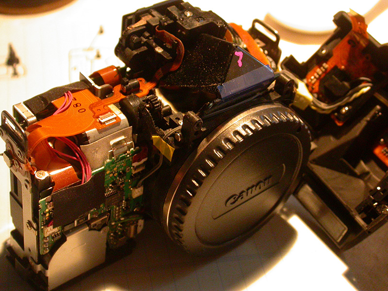 by that point i knew this wouldn't get fixed today. i needed to get a replacement part, which wouldn't arrive until next week at the earliest. i could leave the camera disassembled, or put it back together again and see if it still works. the replacement part would arrive soon enough, but in the meantime i could still take photos with the camera. so i put back the camera.1