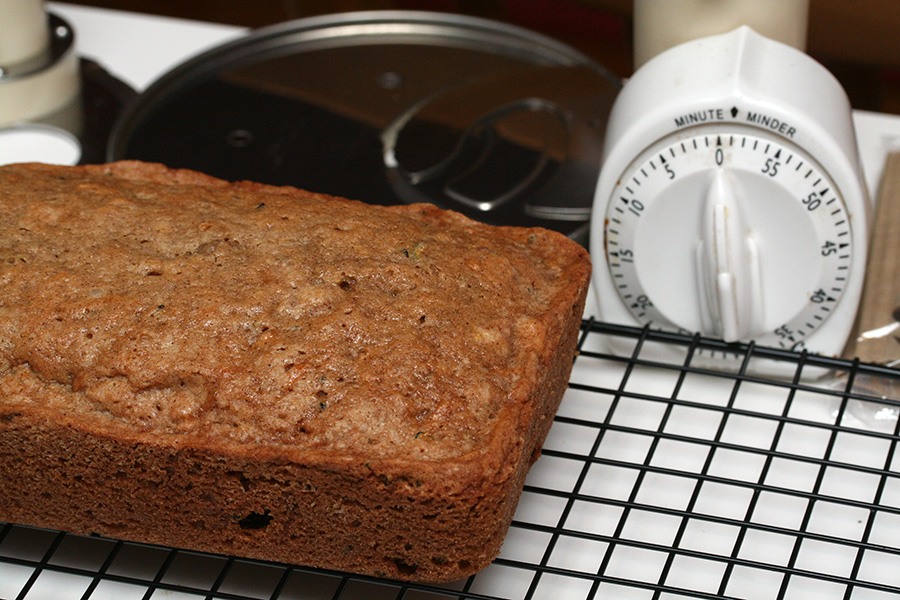 i was in a baking sort of mood and whipped up some more zucchini bread with the leftover large zucchini half still in the fridge. i shredded it in the food processor and ended up with 5 cups of zucchini, way more than i needed. i followed the same recipe as before, this time adding some raisins.
