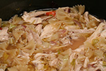i took out the chicken which i then shredded by hand and strained the stock. i sauteed some ingredients for the actual soup: celery, carrots, onion, garlic. i then poured in half the stock, and threw in half a box of bowtie pasta when everything came to a boil. once the noodle was cooked, i added half the shredded chicken. i also put in a tsp of salt and some ground peppers.