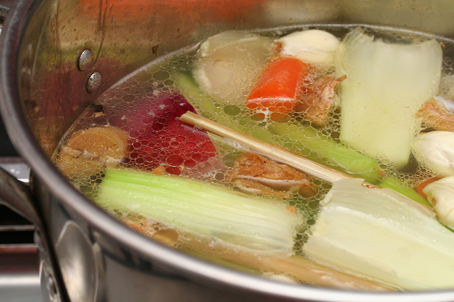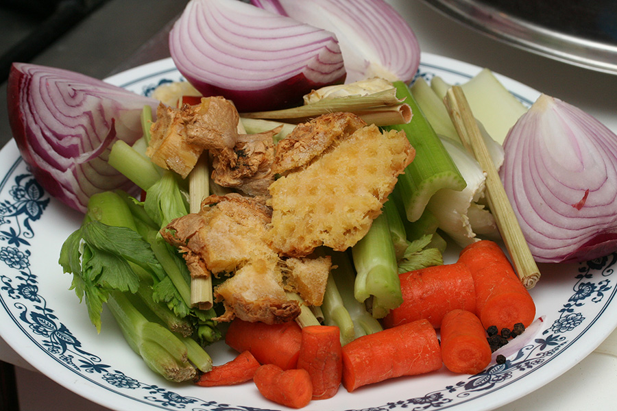 with the weather so miserable, it was a good day to make chicken soup. i don't have a recipe, and the few times i've made it they've all tasted less than stellar. i used a whole chicken (4lbs for $4), cooking it first in the stock pot. when the water finally came to a boil, i added the other ingredients: celery, carrots, onion, lemon grass, garlic, ginger, peppercorns, a tsp of salt, and a dash of vodka. in total, about an hour and a half of simmering before the stock was ready.
