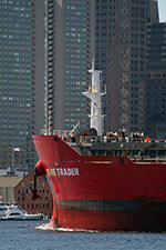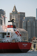 from here (carlton's wharf) i had a great view of boston across the water, with the cargo vessel mare trader (last seen from chelsea) about to transit the city.