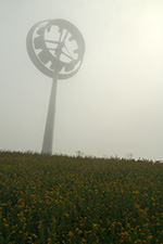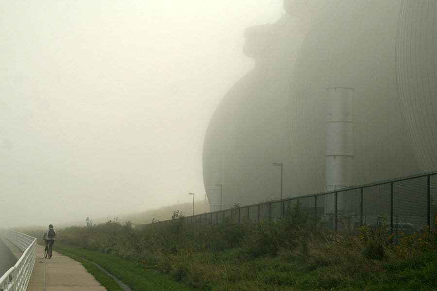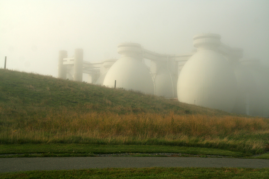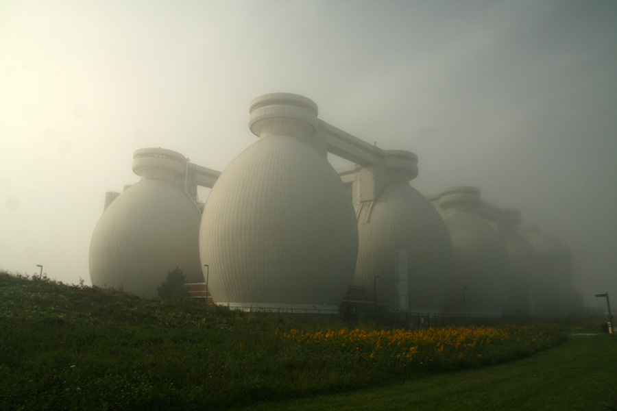the fog wasn't without its beauty however. it made the landscape seem like a dream. catching glimpses of the egg-shaped digesters made them look that much more mysterious and futuristic.