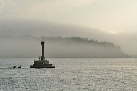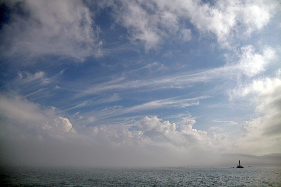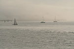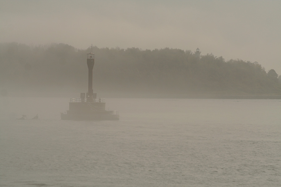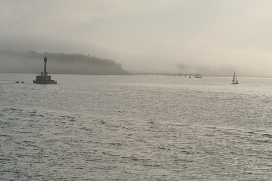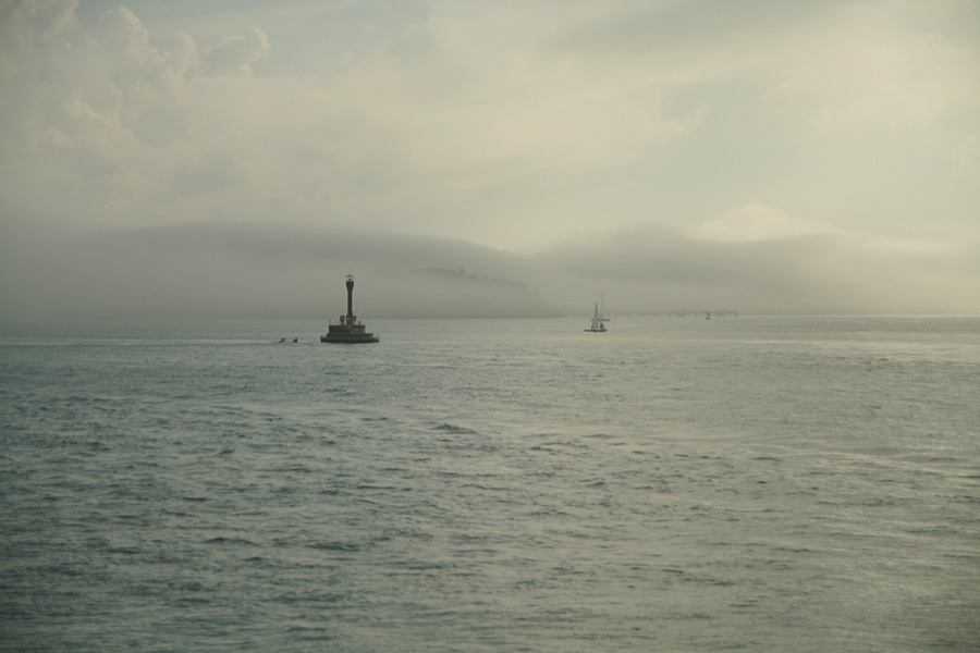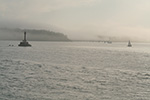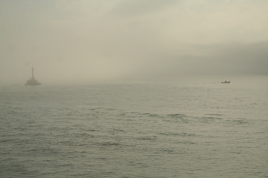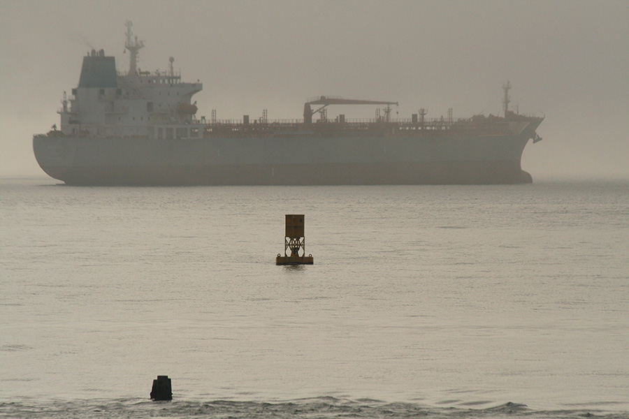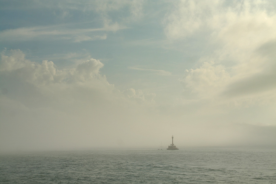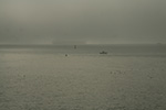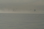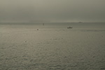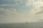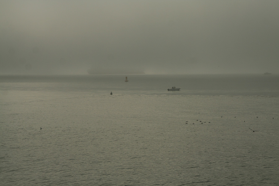 island the fog was so thick that the water and sky was a wall of white mist. although we couldn't see anything, there was a lot to hear, including ship horns and buoy chimes. off on the horizon there appeared to be a large island which turned out to be a tanker ship when the fog lifted a bit. this was the galissas, flying the panama flag, on its way to klaipeda, lithuania.