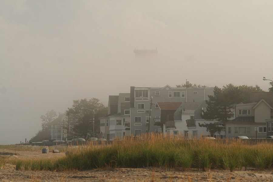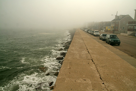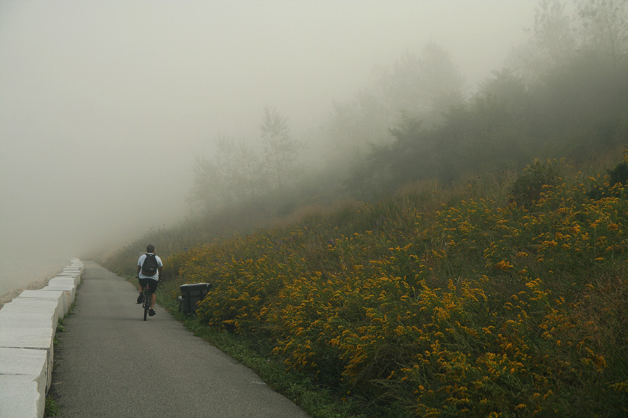instead of following main street, we went north to morton street, facing some marsh lands. we kept going until we went down the wrong direction of one-way wnthrop street. we followed main passed the high school and then went around the gold club. around this time the fog became even thicker. it was misty, it was warm, it was humid - it felt like being in a rain forest, minus the rain forest smell (more like seashore). we went east until we hit winthrop shore drive and followed the beach southwards.