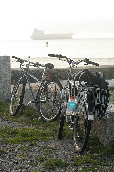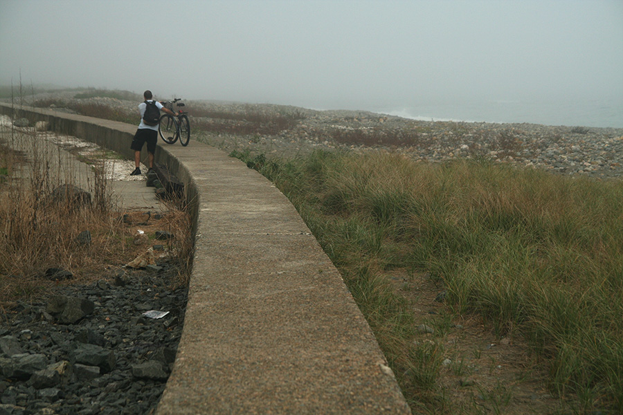 at the end of shore drive, we climbed the seawall with our bikes and continued south. it was dangerous and we decided to turn back when it looked uncertain that the seawall would safely bring us to our destination.