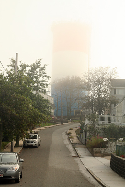marco and i biked to deer island in winthrop today, a distance of 11 miles (more like 13.5 miles due to numerous detours), not including the nearly 3 mile loop around the island, and the return trip home (a total of more than 30+ miles). it didn't seem so far on paper, but navigating through 11 miles worth of city streets required a nearly exhausting amount of concentration. we left around noontime and didn't get back until sometime after 5:00. my butt is so sore from all that riding that i may not be able to sit correctly for a while. i knew how to get into east boston, but once we were there, we did get a little lost trying to find saratoga street from condor/eagle. and when we arrived in winthrop, it took us a while to finally get to deer island. did i mention it was an unusually foggy day? on the island, we could only see a few hundred yards at the most, and the horizon and the sky merged into a disquieting screen of whiteness. we could only see the digesters when we stood next to them. fortunately by the time we made it to the southern tip, the fog lifted a little bit for us to see a few islands, before coming back again.
