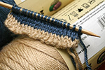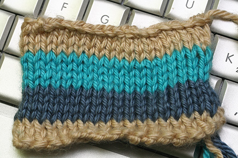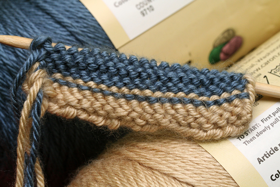 the easiest thing are bands which is what i tried, using some bone and country blue. the yarn has a tendency to snag on my bamboo skewers (not really knitting needles) and when i knit sometimes the strands separate and i can't pick up all of the looping yarn. i'm still not sure if i'm doing it right (particularly how to carry the unused yarn), but at least i managed to switch to a different color.
