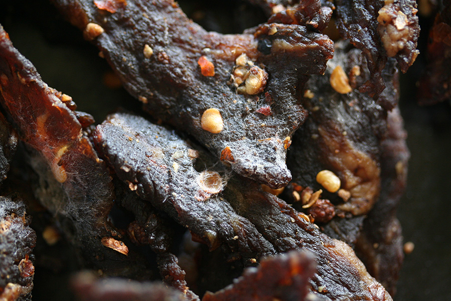 the reason why there's still jerky is because my mother was saving them for after her diet, but she waited too long. i said there was nothing to do but throw them away, but she said they're still edible, maybe wash them first. finally i decided to bake the moldy jerky, figuring a 15 minute blast of 200°F temperature should kill off anything bad. the baking jerky smelled really nice, but the end result was a very brittle jerky. but the mold was gone. my mother and i ended up finishing all the jerky, then waiting the next hour to see if we show symptoms (no ill effects).