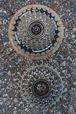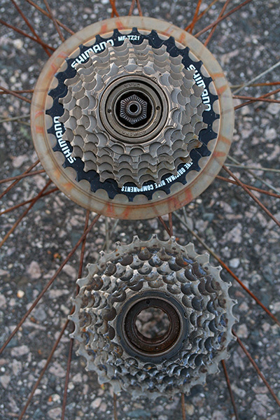 installing a freewheel is much easier than taking one off. i basically threaded it onto the hub by hand, since the pedaling of the bike will naturally tighten the freewheel. i wasn't planning on installing the new one until i got the replacement chain, but i figured a few miles of riding with the worn chain wouldn't create too much wear. the new freewheel spun silently compared to the old freewheel which made a grinding sound. test riding the bike up and down the street i could still hear a grinding noise though. turns out the ball bearings inside the crank pedals might be worn down, and i'll need to replace those.
