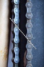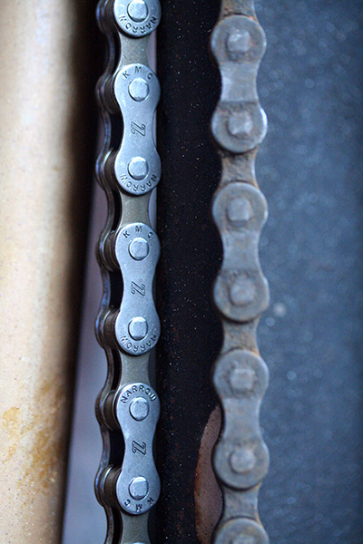 my parents dropped me off at my place where i rode my bicycle to belmont. after having some leftover turkey for a late lunch, i went outside to replace my bike chain. i wanted to show my father how it's done but he was already asleep. i broke the old chain with the chain tool and hung it up in the garage using a neodymium magnet along with the new chain. placed side-by-side, it was easier to figure out how short i needed to make the new chain. the new chain was actually just 3 links longer than the old one, but i shorten the new chain anyway just to match. one thing that was very evident was how stretched out the old chain was, almost an inch worth of displacement compared to the new chain.