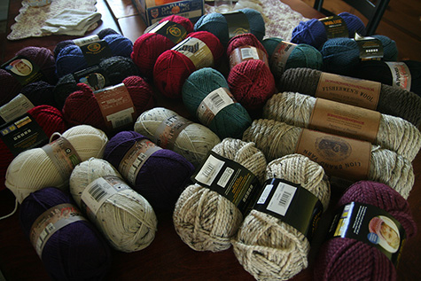 michael's where there was a sale on lion brand wool-ease ($5 each before coupon). these places were busy but it wasn't anything crazy (maybe that drama happened earlier before the crack of dawn). they only had thick & quick (super bulky weight) but my mother still bought a lot. we briefly went to home depot (looking for 60w-equivalent CFL bulbs but they were all sold out because there was a special doorbuster sale) before returning to michael's to take advantage of the after-12:00 50%-off-one-item coupons to buy up some lion brand fishermen's wool (enlisting my father, that came out to be 3 coupons). the final tally was 27 skeins of yarn (plus a package of horehound1 hard candy).