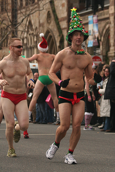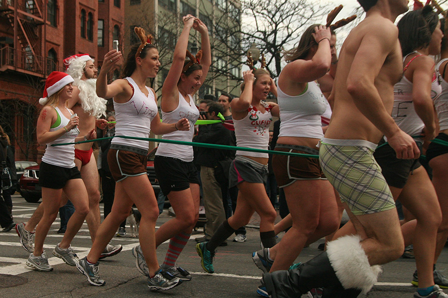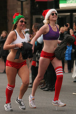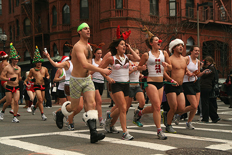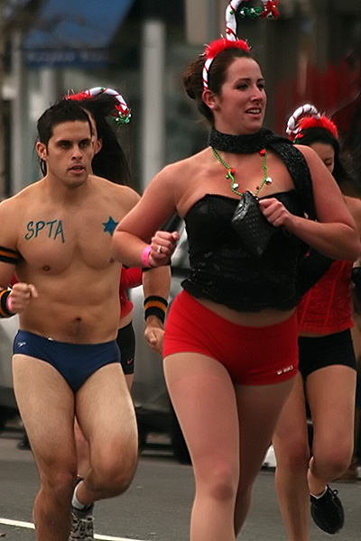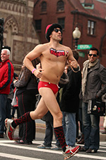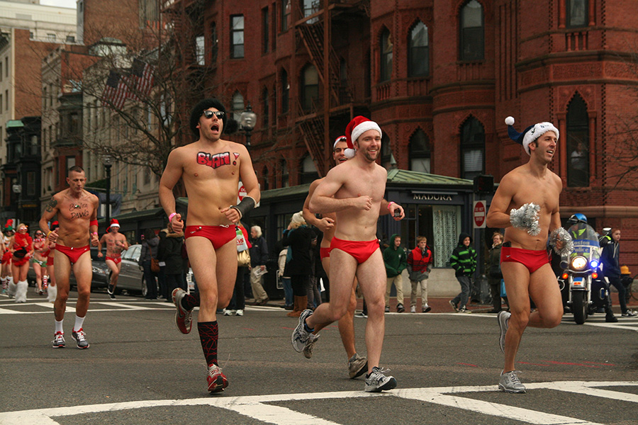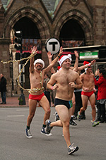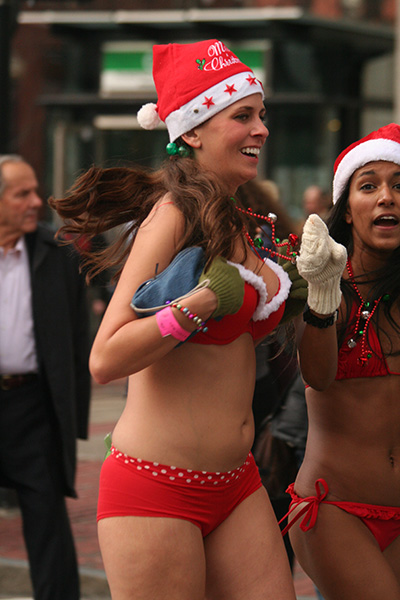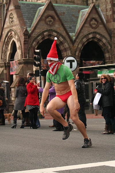 the weather was ideal for photography, that sort of bright overcast. it was cold but only because we were standing outside for nearby an hour; the speedo santa run ran late by half an hour, beginning finally at around 1:30. it seems like each year more and more people run this event. i shot with my 70-300mm telephoto on boylston street but switched to my 17-50mm medium range lens when i ran across to newbury street to catch the run doubling back. the procession is so long nowadays that the frontrunners already passed by the time we got to newbury street.