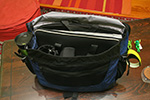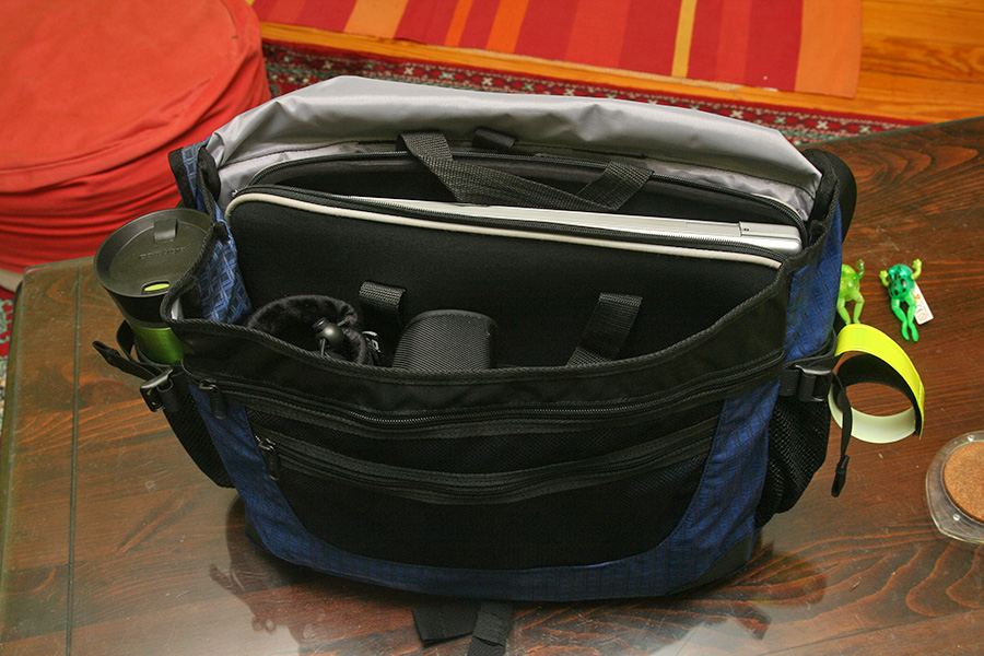 there's a zippered pocket on the flap of the bag, but it's semi-circle in shape so it's difficult to fit certain things (like an envelope for instance, although documents can probably be stuffed in the laptop pocket). there's also a large mesh pocket on the inside, and a separate layer with built-in organizer for pens, credit cards, key strap, and cell phone. i don't like the mesh but i can see why they designed it that way, easier to find things in the see-thru pocket. out of curiosity i tried to fit all my stuff into the bag: my 15" macbook pro with recharger, my camera, my 3 lenses, and an external flash. i was surprised to discover everything fit. my favorite thing on the bag is the additional of two mesh beverage pockets on either side, something missing on my other messenger bag (my eddie bauer one which i use as a computer bag, not my everyday mountainsmith tour bag). the pockets are big enough that i can carry my 16 oz. insulated contigo travel mug. the bag is also designed with biking in mind, and comes with a detachable belt strap (which i've yet to figure out how to attach).