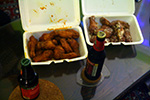 returning home to pick up passport - wing works in davis square: 10 pieces each of garlic & parmesan (gourmet) and rochester - downtown wine & spirits - bigger on the inside than what it looks on the outside - woodchuck amber hard cider & smuttynose old brown dog ale - didn't even look at marco's passport