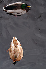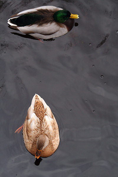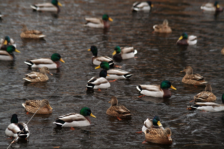 i decided to come back via the charles river in case there was some early winter photo opportunities. from the shore i saw a bunch of mallard ducks swimming in the canal. as i stopped my bike to change into a telephoto lens, all the ducks started swimming towards me thinking i might feed them. it wasn't only ducks; suddenly i found myself surrounded by a circle of begging squirrels. i ignored them and once they realized they weren't going to get a handout they all dispersed. what i wanted to photograph was an unusual pale female mallard swimming with the other normal ducks.
