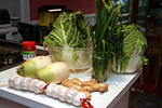 my haul: garlic ($1), ginger ($2), cilantro (3 bunches for $1), scallions (5 bunches for $2), bag of potatoes ($1), and a bag of grapes ($3).