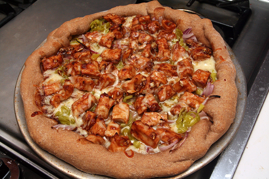 i made some barbecue chicken pizza for dinner, following the same recipe as before. like before, the crust was uninspiring, but there's only so much i can do with a normal oven (compared to a pizza brick oven). maybe next time i can first toast the crust.