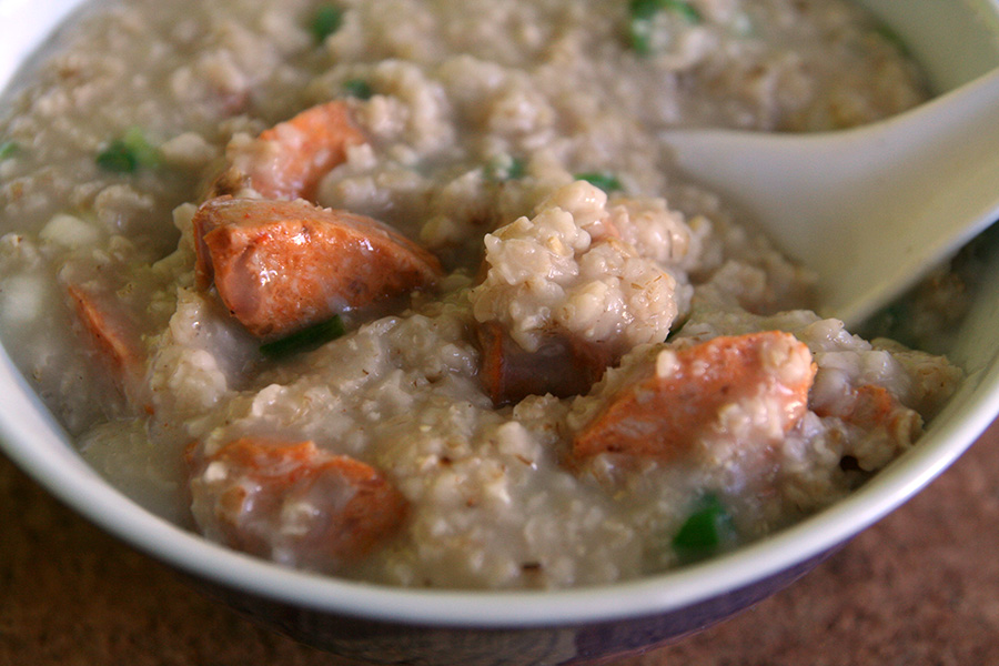 after going to the library to return some books then coming back from a grocery run, i made some oatmeal for lunch: oatmeal, fried onions, chopped scallions, cooked chicken sausages, a pinch of salt.