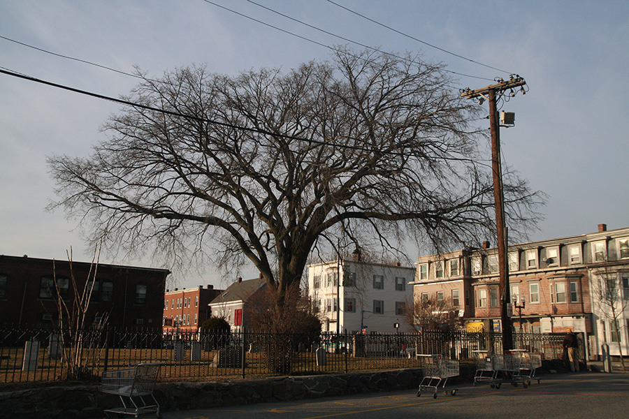 i left the house in the afternoon for the supermarket to stock up on some superbowl snacks for sunday. the usual: chips, salsa, buffalo wings, blue cheese dipping sauce. i never noticed it before but in the cemetery next to market basket is a large full-sized elm tree. even though it didn't have any leaves, i could tell what it was from that classic vase-like elm tree shape.