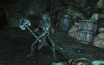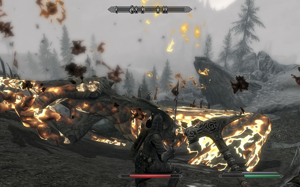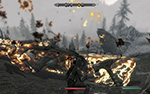 yielding immediately at the first fiery blast. the more dragons i kill (this one was number 4) the less scary they become. being a warrior class character specializing in two-handed weapons (battleaxes and greatswords), it's impossible for me to fight the dragon when it's flying in the air. i shoot arrows at it but i don't think they do anything. the key is to get it down on the ground so i can rush in and strike it a few times with my weapon. grounded dragons are surprisingly fragile, but they can still fight - this particular flame dragon grabbed me with its jaws at one point and threw me to my death. it helps to be near other characters or creatures who can act as bait. the 3rd dragon i killed was like that, i ran to a herd of mammoths that distracted the dragon's attention while i ran behind it and attacked with my battleaxe.