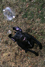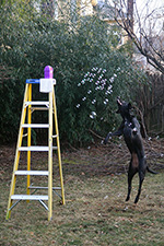 hailey loves the bubbles. normally my sister uses a bubble gun, but having a bubble machine lets the dog play unsupervised. at first she put it on the picnic table but that seemed too low. i got the ladder and put the machine on top which was a better height, giving the dog more jumping room. the only bad thing is the machine tends to vibrate, so it'd slowly rattle itself to the edge; dampening the vibration with a towel seemed to help.