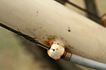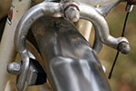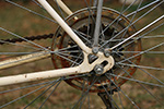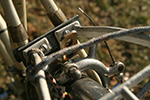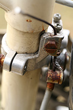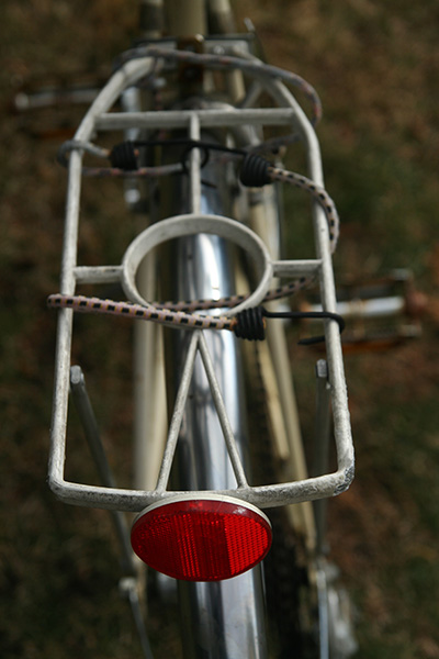 there aren't any eyelets on the seatstays so that part of the rear rack is attached using a clamp. rubber bracers on the seatstays prevent the clamp from marring the finish on the frame, but the clamp had slid off at some point so was now loose. the clamp is held in place by 2 bolts but one of the bolts is missing some washer and nut (i'll need to find replacements at home depot). the rack itself doesn't seem that sturdy. at first i thought it was plastic, but i think it's some kind of rubber-coated metal.