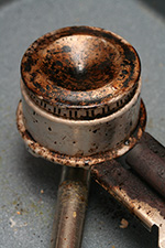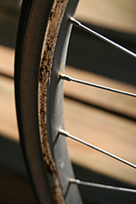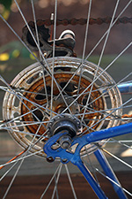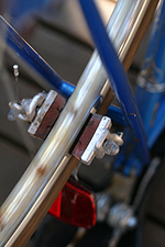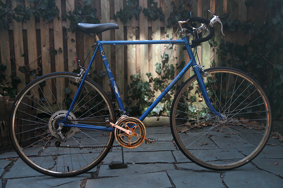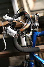 when i got to the address, i felt a little weird just taking the bike from the driveway, and looked around suspiciously to see if any neighbors saw me. there wasn't even time for me to get a good look at the bike, but i examined it as i rolled it back home. for one thing, it was tall, too tall for me to ride. later i measured the frame to be 25", something that wasn't mentioned in the ad. the top tube almost came up to my waist. i was tempted to hop on the bike just to test it out, but traveling downhill, it would've been suicidal. there was rust on the crank, and some rust on the rims. some of the foam covering on the dropdown handlebars were coming off, exposing rusty chrome underneath. as i pushed the bike, i also noticed the front wheel wasn't quite true as it rubbed against the brake pads.