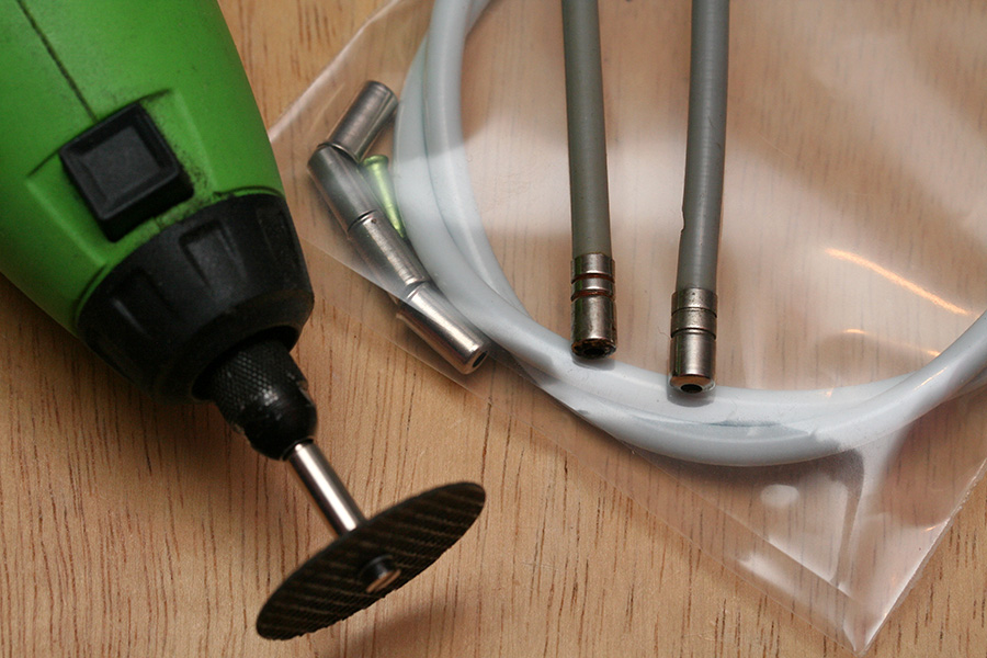 apparently the grey casing was the original and the shop didn't carry any of that particular color. what they had were black, red, white and blue. i was afraid this would happen so in my mind i already decided white would be close enough. 2 feet of white cable casing and a few cable ends set me back almost $5 - the same price of a complete cable kit - but i felt it was worth it just so i could have something that sort of matched.