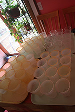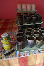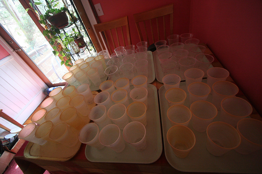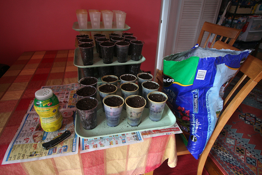 the other big project was to prepare the containers for growing my plants. i'd already brought up the grow lights back in february, and last week i purchased one more bank of grow lights to up my total grow lights to 4. the grow closet can fit 6 trays, and each tray can hold 12 potting containers, for a total of 72 containers, more than enough plants for my own garden, my parents' garden, and my great uncle's garden. the 32 quart bag of miracle-gro moisture control potting soil ($10.47) was exactly enough1 to fill all 72 containers plus some left over to repot a hanging pothos plant.