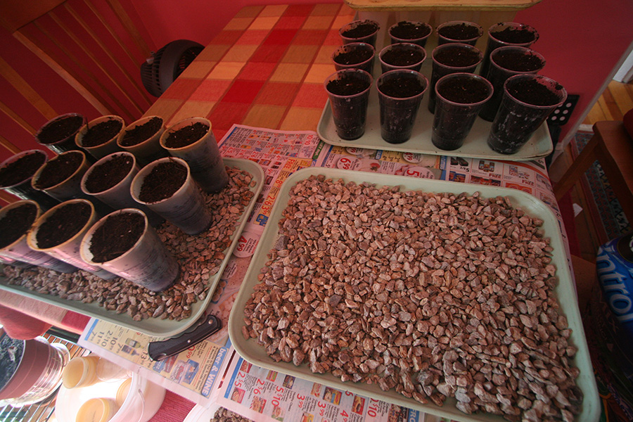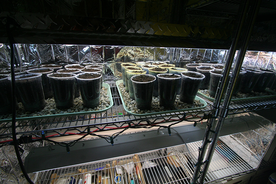 this is actually my 5th season with the grow closet (the first time was back in january 2008) so by now i've got my routine all figured out. after i filled all the containers, i poured crushed gravel onto the trays. once everything is set up, i'll pour water onto the trays to increase the humidity. i haven't figured out what to plant yet so the containers are seedless for now (i also didn't bottom soak them yet). i may also visit a few stores tomorrow to pick up some more seeds.