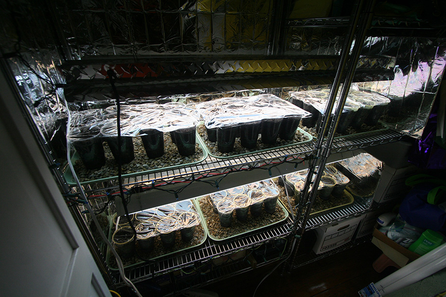 from years past i know what not to plant: nasturtiums (which grow fine outdoor on their own) and cucumbers (indoor transplants don't seem to do as well as those grown directly in the garden). i ended up with a lot of tomatoes (regular and a few cherry variety) and a lot of basil (mostly thai, some sweet). i planted flowers for the leftover containers, including 6 milkweeds. not sure if they had enough time to stratify in the fridge (only about 2 weeks); if not i still have plenty more seeds. finally i put everything into the grow closet, covered with some syran wrap to keep in the moisture. i filled the gravel trays with water. i prefer to germinate in the dark, only turning on the lights once the seedlings emerge.