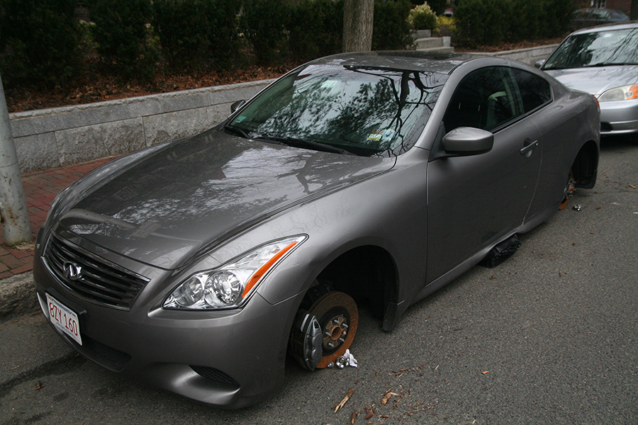 although that looks like the more expensive $50k version) with two of its tires stolen. linnaean is a fairly busy street, and i admire the audacity of the thieves to pull such a daring heist. only the 2 wheels facing the street were stripped. the thieves didn't even take the bolts, courteously leaving them by the bare wheels. the funniest thing is the crushed plastic milkcrate; i can't imagine they used that to hold up the car (or perhaps milkcrates are stronger than they appear).
