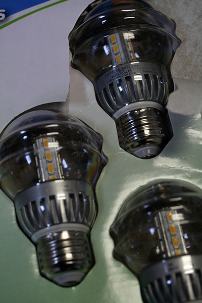 i tried out the LED bulbs immediately, installing one on the front porch, one on the back porch, and one the basement stairwell. using only 2.5 watts, each LED bulb is supposed to be the equivalent of a 54 watts bulb.
