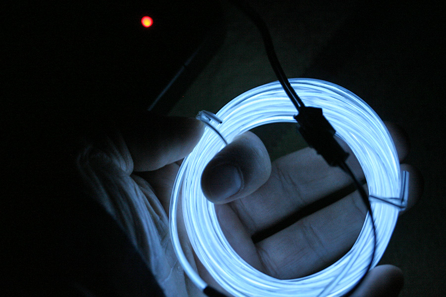 the first thing i played with was the electroluminescent (EL) wire i ordered through amazon to pad my order so i could score free shipping. advertised as white, the color has a strong blue-violet tinge. the wire itself is much thinner than i expected, but is generously long at 10 feet in length. powered by 2 AA batteries, a button toggles between 2 speeds of flashing and always-on mode. i'm thinking i could use it as a safety light and tie it around the frame of my bike for some cool effects. the power supply probably isn't waterproof but i wonder if the wire itself would work in the rain?