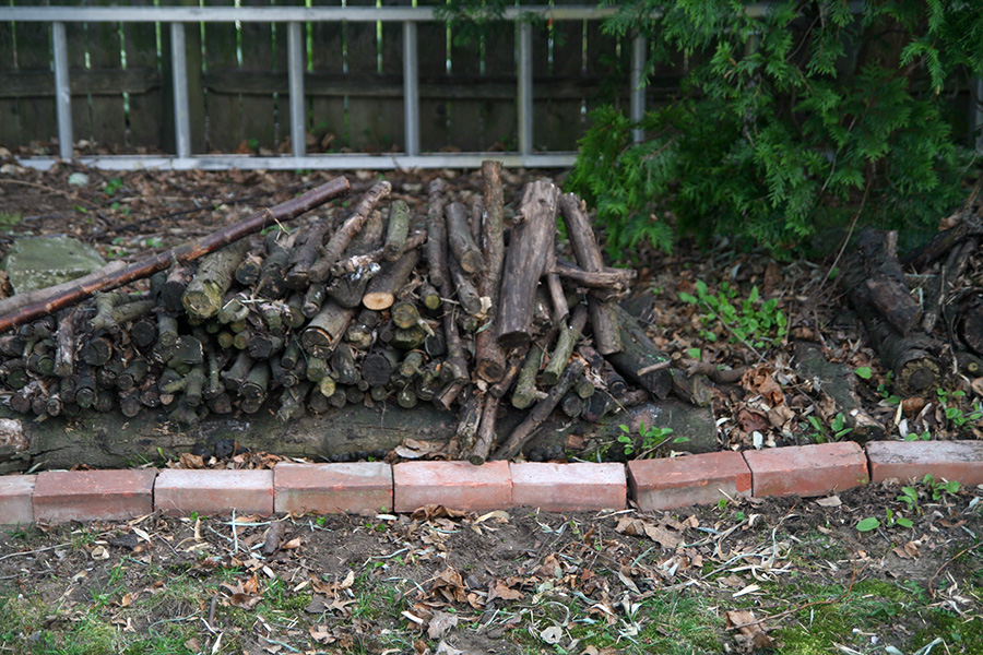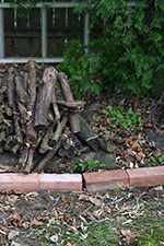 i came to belmont primarily to get some plastic cups drilled so i can use them as pots to plant some more seeds. but i ended up doing everything else but that: i recharged my motorcycle battery; we tested the portable backup power source and determined it was the dead battery that needed replacing; we restarted our rain barrel stations; i dug out some dandelions, garlic mustard, and celandine; and i edged the backyard with the pile of bricks my sister got from one of her nanny care families. there was already a brick border but there were gaps.