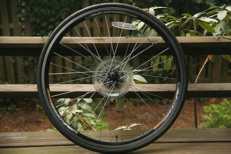 after i got the tire inflated, i wiped it down with a paper towel. the wheel itself is in excellent condition, and should i ever decide to disassemble the denali for parts, the wheel would be great for a different road bike. i have another spare tube but for the time being i'm not going to bother changing the front wheel (until i have a reason to, like a leak). i put the rear wheel back onto the bike tomorrow morning and see it completely assembled for the first time. i'm still wishfully thinking i can ride this bike - maybe if i wore some platform shoes so i could clear the top tube?