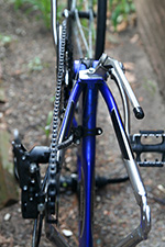 i like that there are eyelets on the frame for fenders and a rear rack. at one point there was a bottle cage but the previous owner must've removed it. even though one of the tubes was bad, the tires themselves are in very good shape, with no worn treads (the tires still have small rubber flaps at the seams of the contact surface). because i replaced only one of the tubes, the tires are currently mismatched: schrader valve in the front, presta in the back. it's kind of a hassle to inflate the tubes because i have to toggle the pump head on my hand-held pump; not that it does much good because it's very difficult to reach 100+ psi of tire pressure by hand (hopefully my floor pump will arrive soon). contrary to the thick layer of grease on the transmission, i suspect the previous owner didn't ride this bike very much since it's practically new.