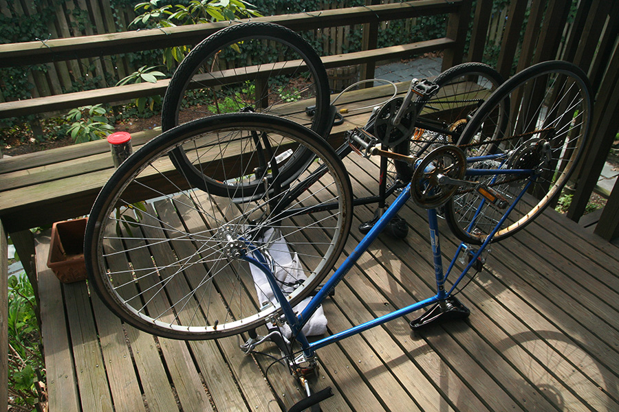 most of the afternoon was spent out on my backyard deck working on some bikes. the weather was pleasant with temperature in the 60's, warm enough to work in a t-shirt. earlier i'd wheeled out the jetter road bike i picked up for free. i knew the 2 wheels needed some minor truing, but wanted to see what else needed fixing. given the large size of the frame, i was surprised how light it was.