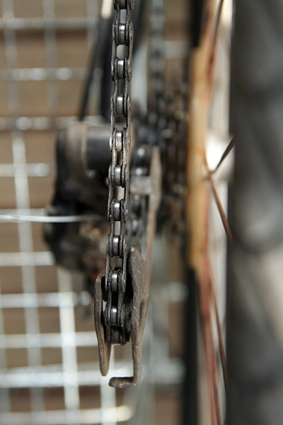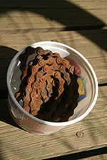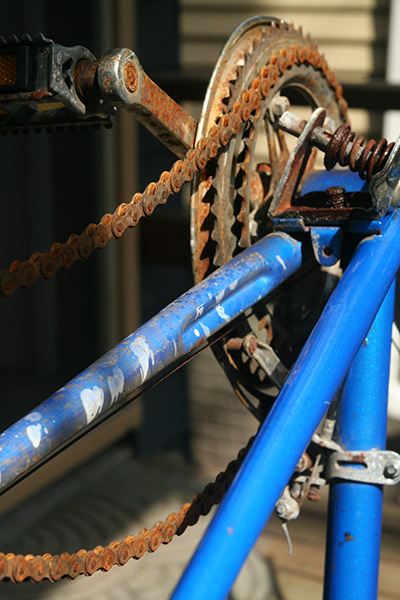 apart from the wheels i also removed the chain. although not the most rusted chain i've ever seen, some segments were corroded enough that they didn't bend easily. i made sure i didn't push the pin out completely because i might want to reuse the chain since i don't plan on spending too much to fix this bike. i've got a roommate arriving in september and this is the bike i was going to give him to ride (i heard he's tall, hopefully tall enough to fit this frame).
