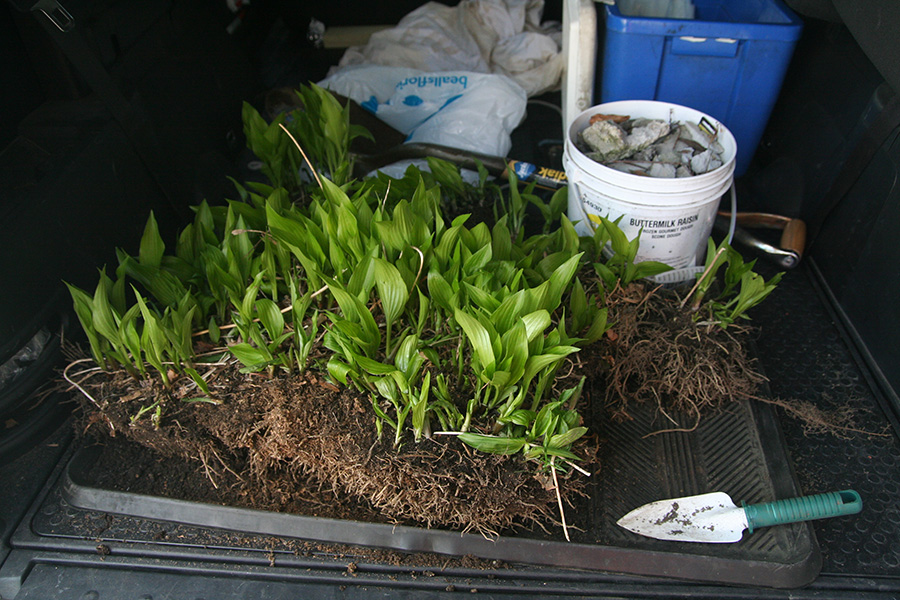 it felt strange to arrive at someone's house and to start digging up their yard. i was instructed to simply show up and dig, no need to call or ring the doorbell since the owner wasn't home. 2 people greeted us; at first i thought they were the owners, but turns out they were neighbors looking to score some hostas as well and were trying to figure out where to start. my father didn't waste any time and began working the shovel. these hostas must've been growing here a long time because the roots formed a dense carpet. we ended up taking about a 6 feet section, me loading up the pieces into the car while my father continued digging. i was hoping for a few root stems, but ended up collecting more hostas than i knew what to do with.